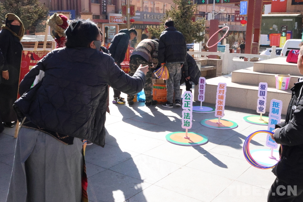 在新時代文明實踐集市,以互動游戲為主,分設(shè)了“文明新風(fēng)”主題套圈游戲和“文明舉止”紅黑榜分類游戲、“垃圾分類”沙包投放游戲、文明家風(fēng)親子拼圖等項目,每個區(qū)域前都擠滿了游玩體驗的人群?!斑@個套圈游戲很受歡迎,我們把‘愛國敬業(yè)’‘反對鋪張浪費’等社會主義核心價值觀有關(guān)內(nèi)容制作成套圈道具,讓大家在趣味活動中了解文明理念。”理塘縣委宣傳部工作人員介紹道。