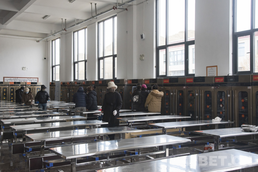 圖為長(zhǎng)所鄉(xiāng)完全小學(xué)集中安置辦學(xué)點(diǎn)內(nèi)新規(guī)劃的學(xué)生食堂,教職工們正在清理食堂衛(wèi)生。 攝影:趙振宇