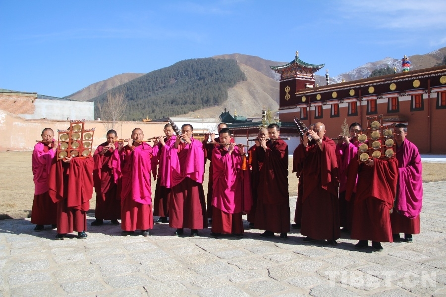 淡藍(lán)的天空中流淌著潔白的卷云,微風(fēng)陣陣拂過,窗前的香布一起一落,十多位身著紅色僧衣的拉卜楞寺僧人在陽(yáng)光下演奏拉卜楞寺佛殿音樂道得爾。道得爾為藏文???????的音譯,意為用多種樂器合奏的音樂,多見于重要活動(dòng)儀式時(shí)!