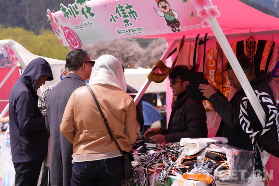 沿著蜿蜒的小路,一邊是錯落有致的桃花樹,一邊是特色集市。“這些是工布男女服飾、這是馬套、這是藏式包包……都是我們合作社的工作人員手工制作的。”在舞臺一旁的桃花小集市,林芝市巴宜區(qū)絲綢藏裝定制農(nóng)牧民專業(yè)合作社負責人尼瑪扎西正向游客一一介紹自家展銷點的產(chǎn)品以及其背后的文化和制作過程。經(jīng)過一番討價還價,一千余元的“大單子”順利成交,游客將一件件精美的巴宜“小禮品”裝進袋子和尼瑪扎西揮手告別。