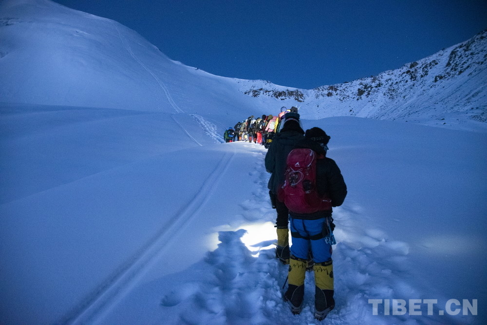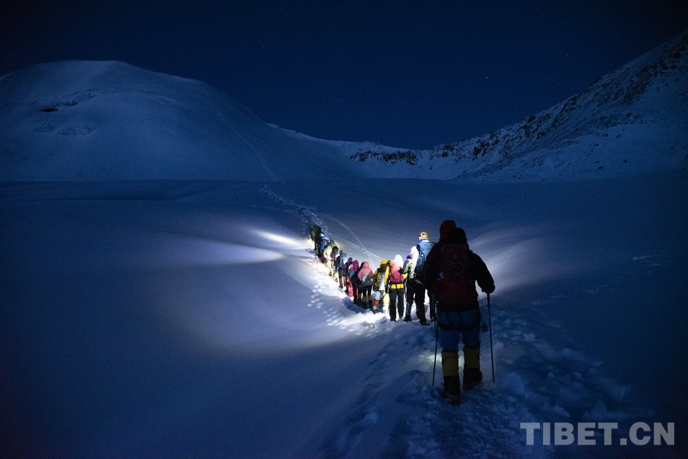 圖為5月3日,登山愛好者在凌晨出發(fā),向海拔6010米的洛堆峰峰頂進(jìn)發(fā) 攝影:趙振宇