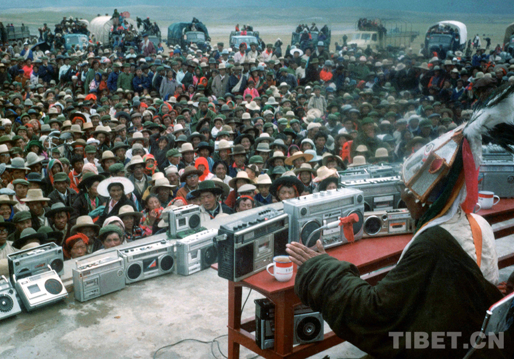 圖為說(shuō)唱藝人阿達(dá)在那曲賽馬會(huì)上說(shuō)唱《格薩爾》的傳奇故事,臺(tái)上擺滿了牧民群眾的各式錄音機(jī)(唐召明提供,才龍1987年前后攝)