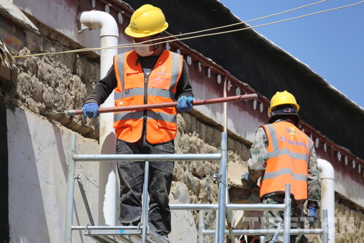 圖為日喀則市拉孜縣錫欽鄉(xiāng)崗西村,民房正在進(jìn)行維修加固