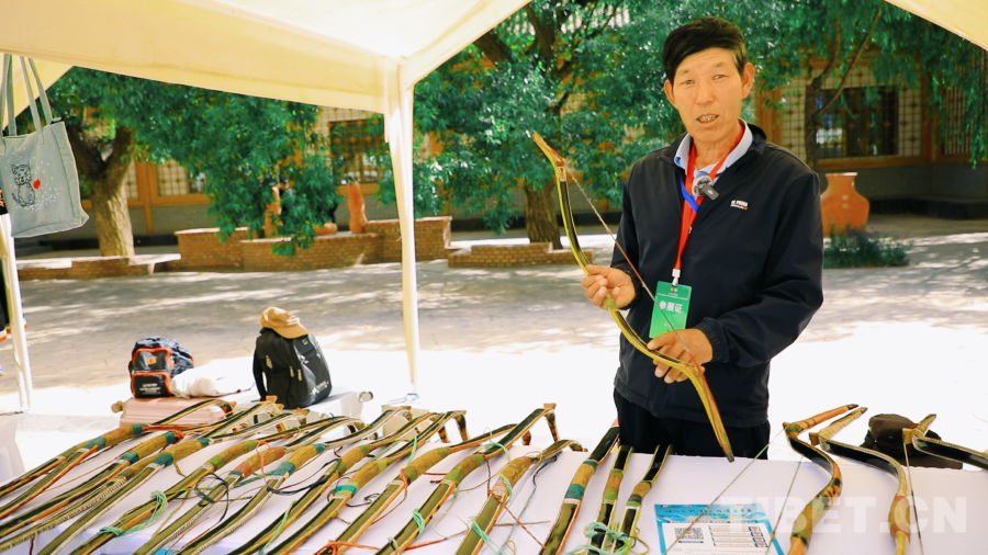 馬國財是一位來自青海省海東市樂都區(qū)的南山傳統(tǒng)牛角弓非遺傳承人,自曾祖父起他家在制作牛角弓方面的技藝是家喻戶曉的。他深受父輩的影響,做弓技藝更是嫻熟。此次活動,他帶來了自己的幾十張得意之作“南山傳統(tǒng)牛角弓”,在現(xiàn)場向?qū)ε=枪信d趣的游客耐心地講解選材、打磨、粘合、鋪筋、扎把、陰干、調(diào)試、加牛角、打磨、貼樺皮、上色等弓箭的制作過程,以及在生活當中的實際應用,讓更多的人了解到它不僅僅是一張普通的弓,更是祖祖輩輩的智慧結晶和珍貴非遺。