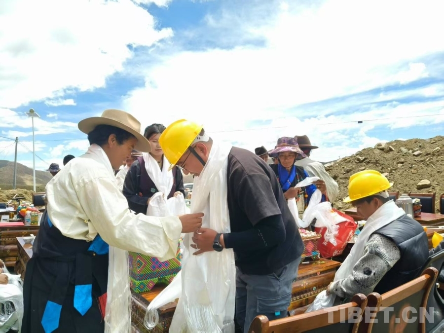 圖為村民向施工隊工作人員敬獻(xiàn)哈達(dá)。