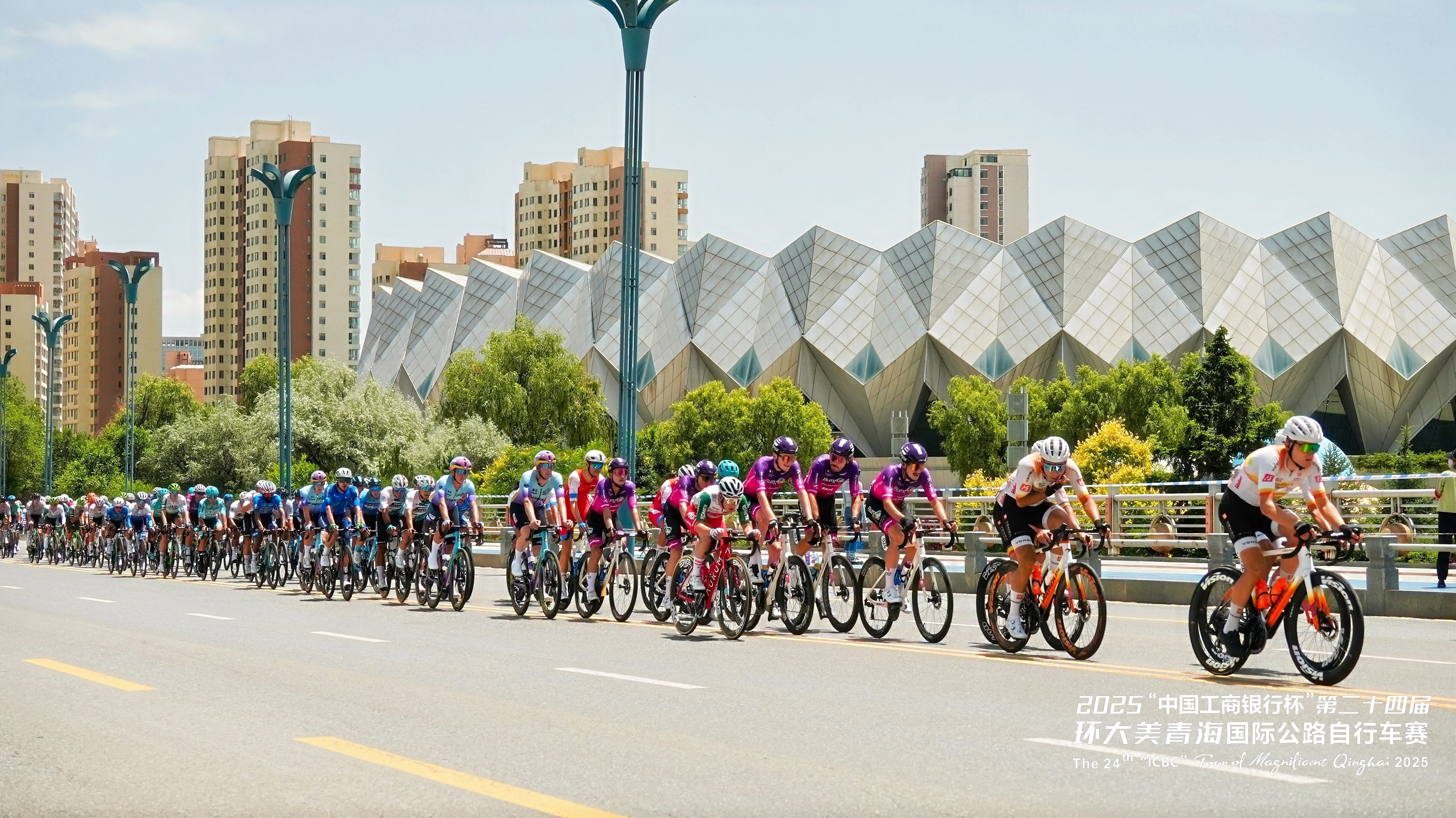 第二十四屆環(huán)青賽的第一賽段——西寧繞圈賽,選手們穿行于西寧市繁華的鋼鐵森林中,感受這座高原古城的現代活力。圖為選手們騎行至青海體育中心。