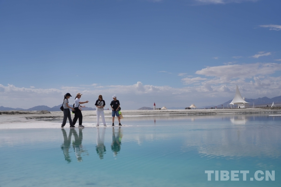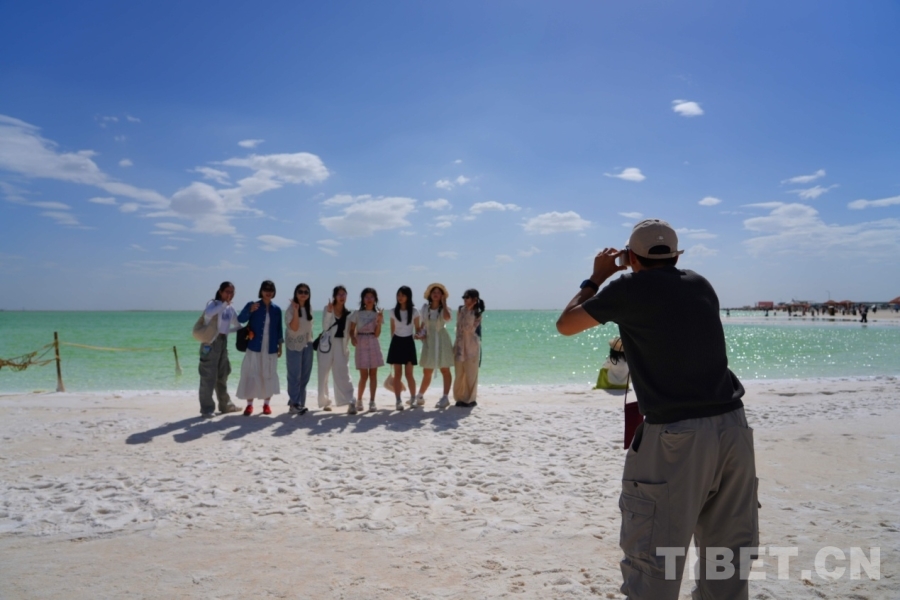 在海西蒙古族藏族自治州格爾木市,海拔2670米的察爾汗鹽湖,翠綠之美令人震撼,風(fēng)起波動,湖面如碎鉆鋪就的星河;天然形成的鹽花形態(tài)各異宛如珊瑚叢生,在陽光下,閃耀著璀璨的光芒;浮在鹵水上的“萬丈鹽橋”延伸至天際,橫跨湖面,還有周邊的現(xiàn)代化采鹽船,輸鹵管道,車來車往,工業(yè)設(shè)施與自然景觀形成強(qiáng)烈對比。來自妙法寺劉金龍中學(xué)三位女生欣賞著美景,也紛紛討論這次令人驚嘆的“自然課堂”。鐘澄情同學(xué)不自禁感慨:“這里跟網(wǎng)上宣傳的一樣美!就像是上帝打翻的蘋果汁。”曾婉晴同學(xué)驚嘆道:“曾經(jīng)我只聽說過茶卡鹽湖,來到這里才知道察爾汗鹽湖是中國最大、世界第二大的鹽湖,面積相當(dāng)于56個茶卡鹽湖,鹽儲量可以讓全球80億人吃上兩千年。”而許馨月同學(xué)更加震撼這里工業(yè)與自然相互交融的獨特魅力,直呼這是一座真正的“寶庫”!
