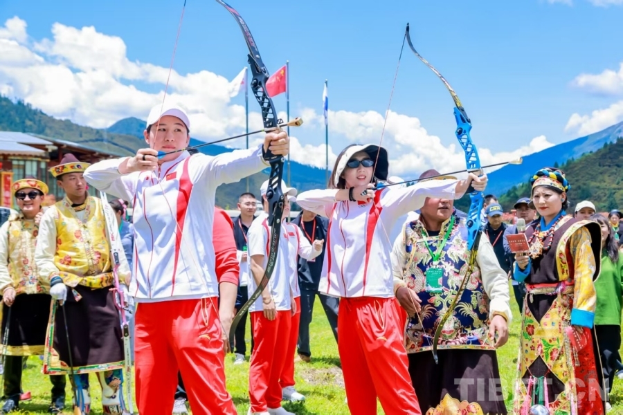圖為奧運冠軍同當(dāng)?shù)卮迕褚煌w驗西藏傳統(tǒng)體育項目工布響箭