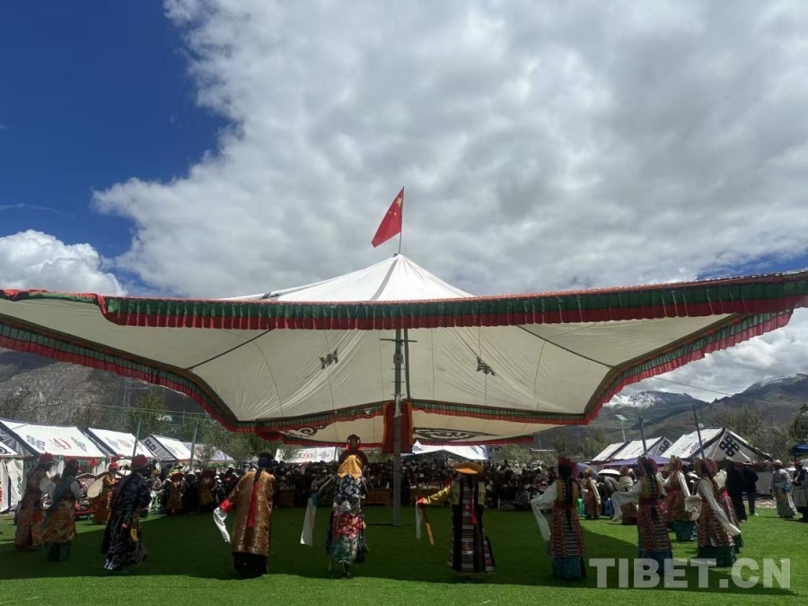 圖為日喀則南木林縣非遺林公園內(nèi)的湘巴藏戲展演吸引了大批觀眾駐足觀看