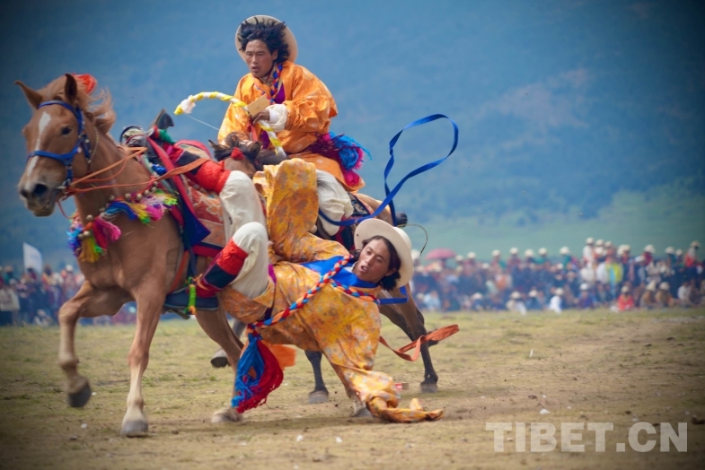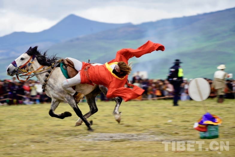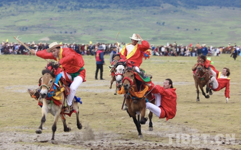 此外,來自奔戈鄉(xiāng)、禾尼鄉(xiāng)、曲登鄉(xiāng)和村戈鄉(xiāng)的馬隊(duì)還進(jìn)行了傳統(tǒng)馬術(shù)表演,馬背倒立、馬肚藏身、俯身拾哈達(dá)等精湛技藝,讓觀眾大飽眼福,充分感受到了理塘賽馬文化的魅力。
