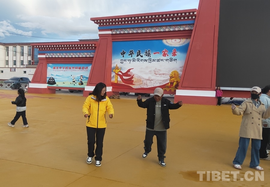 圖為在尼瑪縣民族團(tuán)結(jié)進(jìn)步主題廣場(chǎng),筆者向扎西索朗學(xué)跳鍋莊舞 攝影:昂翁洛布