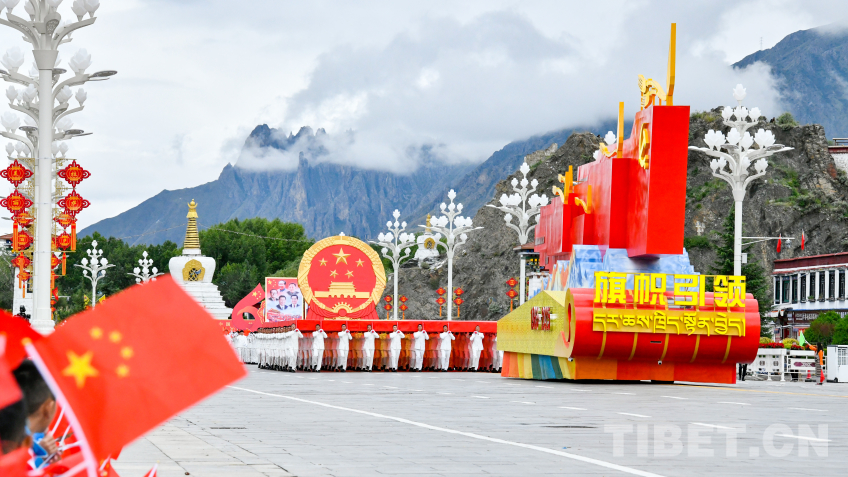 “旗幟引領(lǐng)”彩車,車頭矗立巨型黨旗,八面五星紅旗有序排列其后,展現(xiàn)了在黨中央堅強領(lǐng)導下,西藏各族兒女同心同向、團結(jié)奮進的時代圖景。