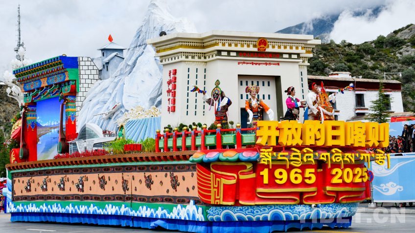 日喀則市彩車,彩車頭部為吉隆口岸造型,象征著日喀則作為面向南亞開放中心城市的特殊戰(zhàn)略地位。國門前,兩名著定日服飾的地震災區(qū)群眾代表,手捧切瑪,表達對以習近平同志為核心的黨中央的深深感恩之情。