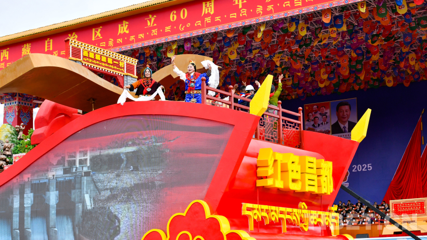 昌都市彩車,以“西藏第一面五星紅旗升起的地方”“西藏解放第一村”為基調(diào),紅色印記格外醒目?!凹t色昌都”彩車,車體以紅旗為主線勾勒輪廓,承載著雪域兒女對西藏60年輝煌成就的深情禮贊。