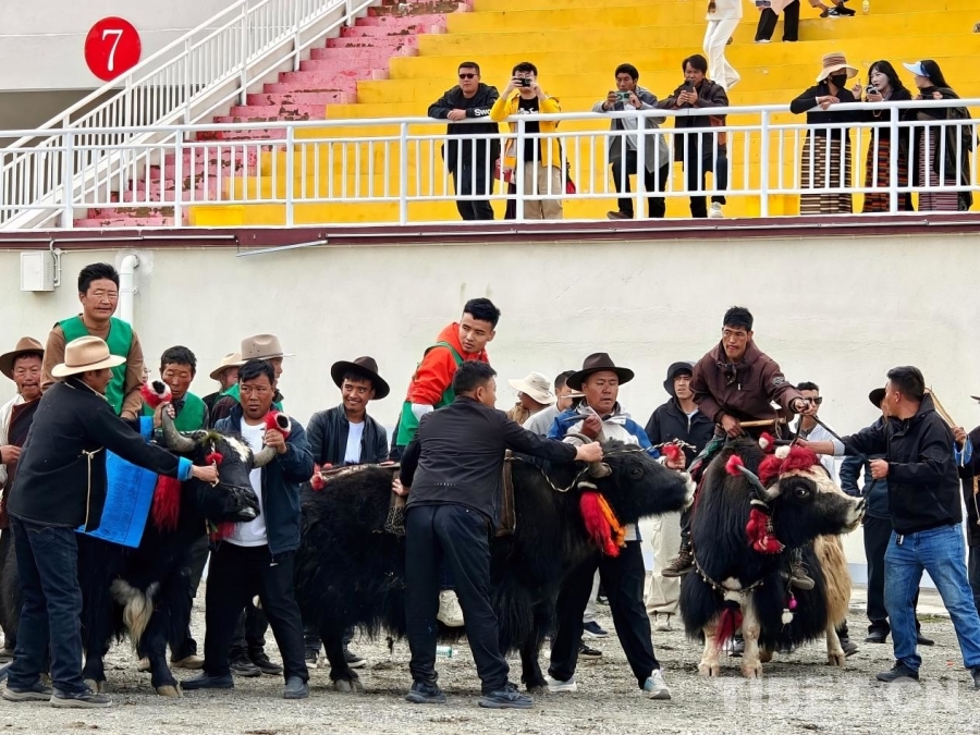 江孜達(dá)瑪節(jié)是當(dāng)?shù)刂匾膫鹘y(tǒng)節(jié)日之一,賽牦牛作為節(jié)日的項目,深受群眾喜愛。比賽中,牦牛在騎手的指引下奮蹄奔騰,場面震撼,引得觀眾驚呼連連、掌聲不斷。這一傳統(tǒng)體育活動不僅展現(xiàn)了當(dāng)?shù)剞r(nóng)牧民精湛的馴牛技藝和勇敢精神,也豐富了群眾的文化生活。(中國西藏網(wǎng) 記者/次旦拉姆)