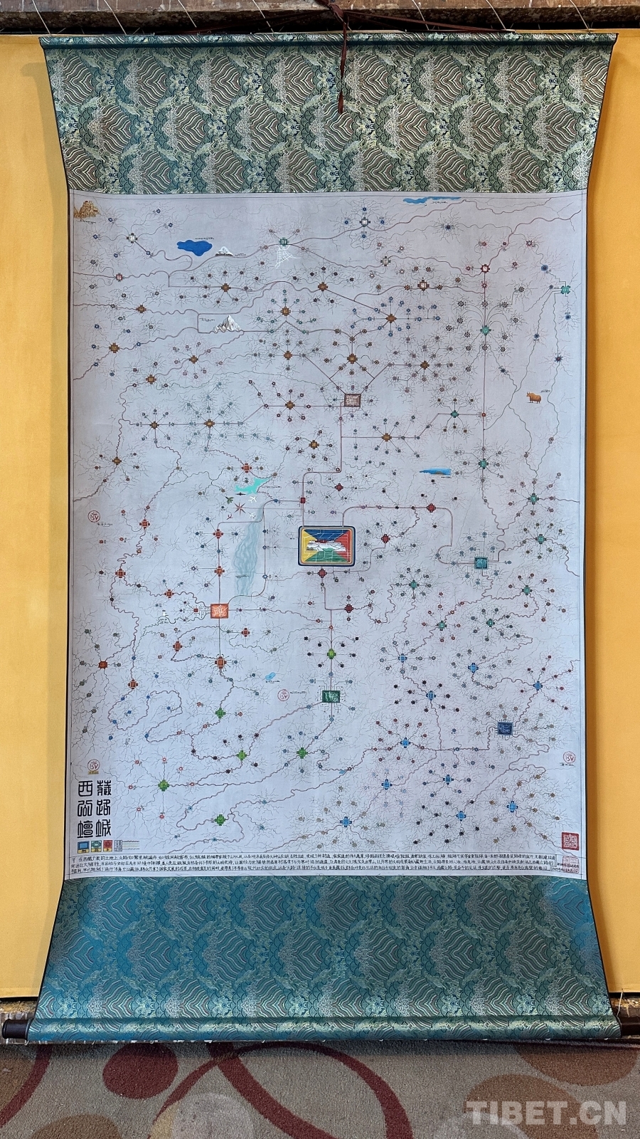 具體而言,畫面上方赭石色代表日喀則市及各縣鄉(xiāng)鎮(zhèn),再往上的白色區(qū)域是以嘎爾縣為中心的阿里地區(qū);左側(cè)菊黃色為山南市;右側(cè)深綠色是那曲市;下方草綠色為林芝市;右下方藍(lán)色則是昌都市。