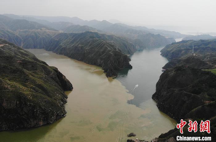 圖為甘肅永靖縣劉家峽遠眺洮河匯入黃河,入河口呈現(xiàn)出“二龍戲珠”的交匯奇觀。兩條河流匯聚于此,“涇渭分明”,交融卻不滲透,再加上河中石山,猶如兩條巨龍游戲于此,在當(dāng)?shù)剡@景象也被稱為“二龍戲珠”。(資料圖) 楊艷敏 攝