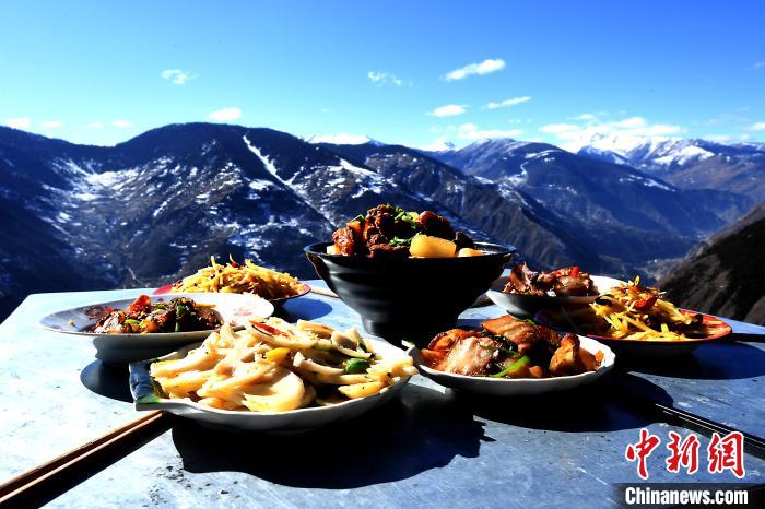 正午時(shí)分,紅燒牦牛筋、臘肉香腸、紅苕稀飯等一道道菜肴,從一間農(nóng)家小屋里新鮮出爐,端到海拔3200多米的懸崖旁的方桌上。四川省阿壩州小金縣麻足寨,天藍(lán)如洗,幽谷新雪,冬日暖陽下,白云似觸手可及。甘家溝村扶貧第一書記張飛如常打開手機(jī),用短視頻記錄下“云端餐廳”村民用餐的場景。