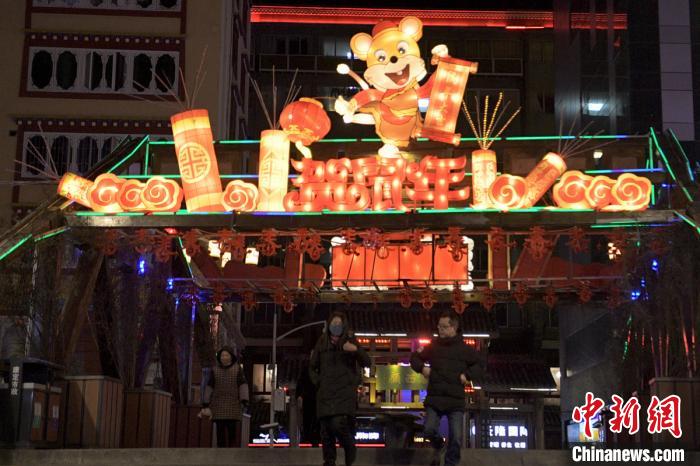 康定街頭民眾從“鼠年”彩燈組下穿過。劉忠俊 攝