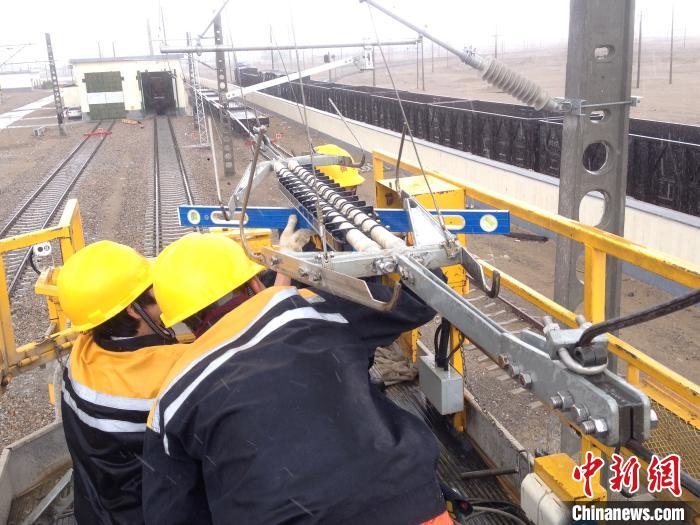 圖為中國鐵路青藏集團有限公司西寧供電段格爾木接觸網(wǎng)大修工區(qū)的接觸網(wǎng)工對分段絕緣器進行測量。周賀 攝