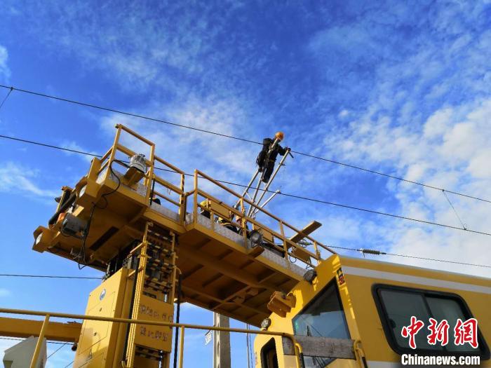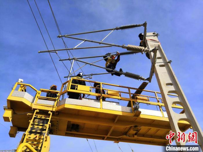 圖為中國鐵路青藏集團有限公司西寧供電段格爾木接觸網(wǎng)大修工區(qū)的接觸網(wǎng)工在檢修接觸網(wǎng)。周賀 攝