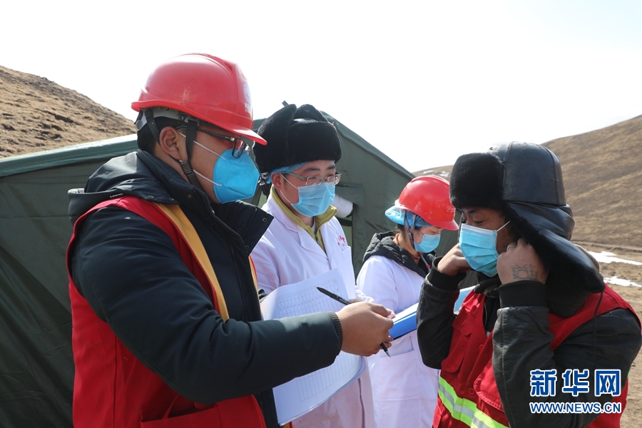 青海-河南±800千伏特高壓工程青2標進行復(fù)工后人員測溫、防護用品發(fā)放。新華網(wǎng) 鄒建華 攝