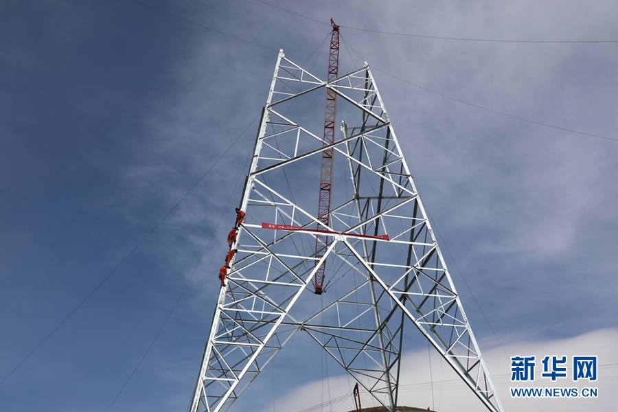 青海-河南±800千伏特高壓工程青2標復(fù)工現(xiàn)場,施工人員進行組塔作業(yè)。新華網(wǎng) 鄒建華 攝