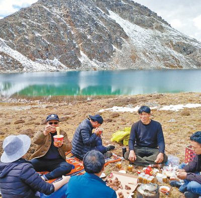 劉學(xué)燦(左二)和鄉(xiāng)親們一起爬上海拔5000米的朵絨麻措湖,考察道路交通情況。宋豪新 攝