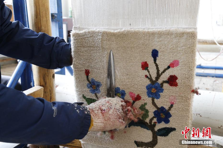 加牙藏毯第七代傳人楊永良利用剪刀對編織好的藏毯進行精加工。中新社記者 馬銘言 攝
