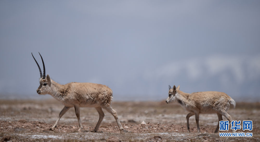 5月15日,兩只藏羚羊在可可西里地區(qū)活動(dòng)。新華社記者 吳剛 攝