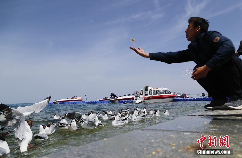 5月19日,一位游客在青海湖二郎劍景區(qū)內(nèi)給水鳥喂食。當日是中國旅游日,游客在青海省海南藏族自治州青海湖二郎劍景區(qū)內(nèi)乘船觀湖、與水鳥互動、感受初夏青海湖的海天一色之美。中新社記者 馬銘言 攝
