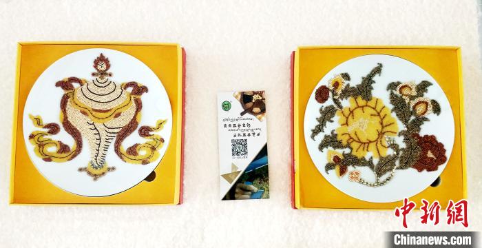 “在我們藏族地方習(xí)俗中,為了祈盼五谷豐登,不少人家都會(huì)用五谷拼湊出彩色圖案來供奉。像青稞、小麥、油菜籽等,通過巧妙構(gòu)思,‘繪’制的圖案就是‘五谷畫’?!痹诜g的幫助下,索南本用藏語如是介紹自己來自高原的手藝。