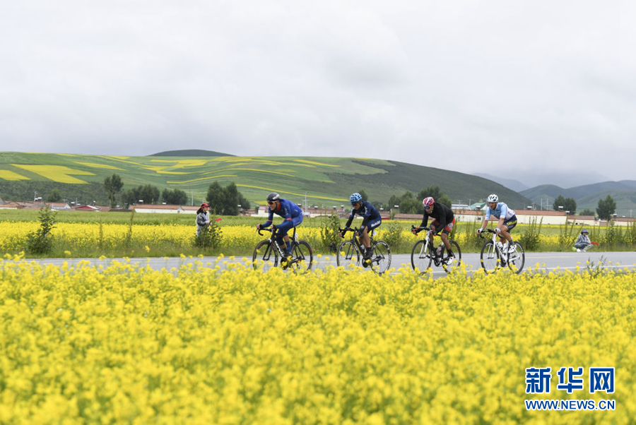 2019年7月21日,車手們在比賽中騎行。當(dāng)日,第十八屆環(huán)青海湖國際公路自行車賽展開第八賽段——西海鎮(zhèn)到青石嘴的角逐。新華社 張龍 攝
