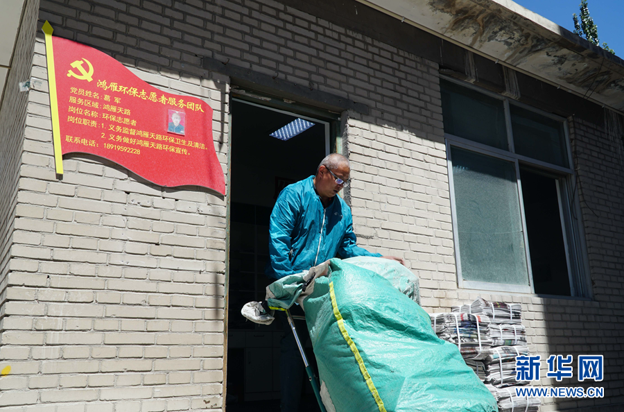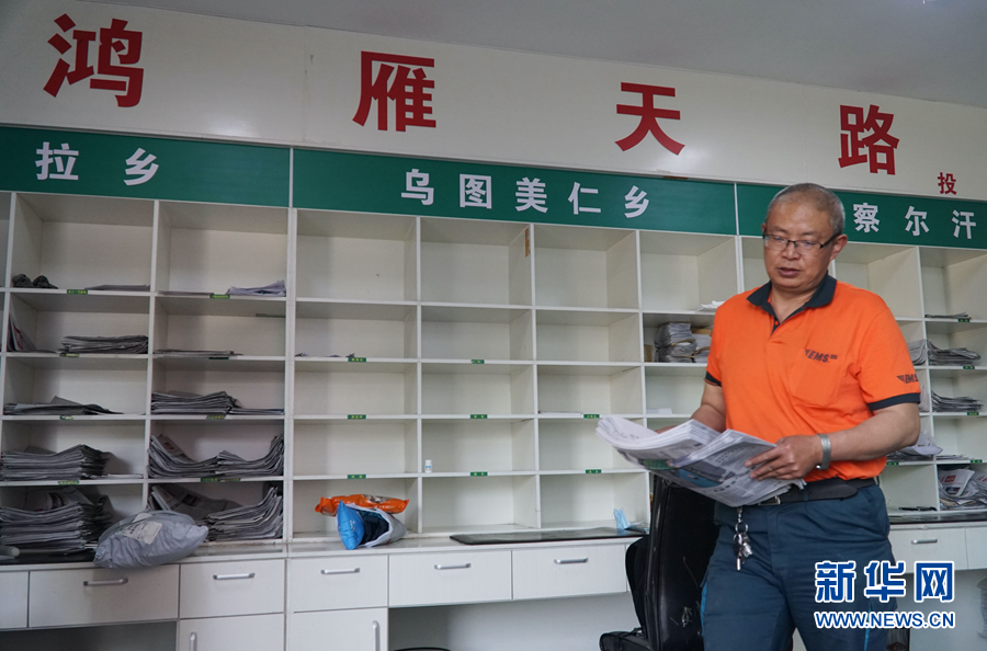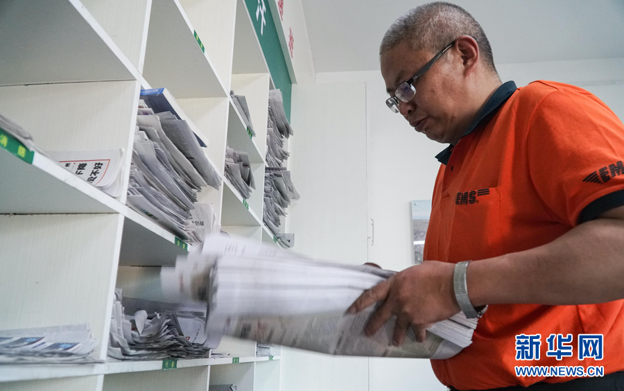 6月29日,中國郵政集團(tuán)有限公司格爾木市分公司的郵件分揀大院里,葛軍在整理報紙。新華社記者 耿輝凰 攝