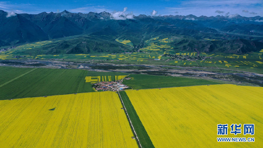 這是7月22日拍攝的門源回族自治縣境內(nèi)的油菜花田(無人機(jī)照片)。新華社記者 吳剛 攝