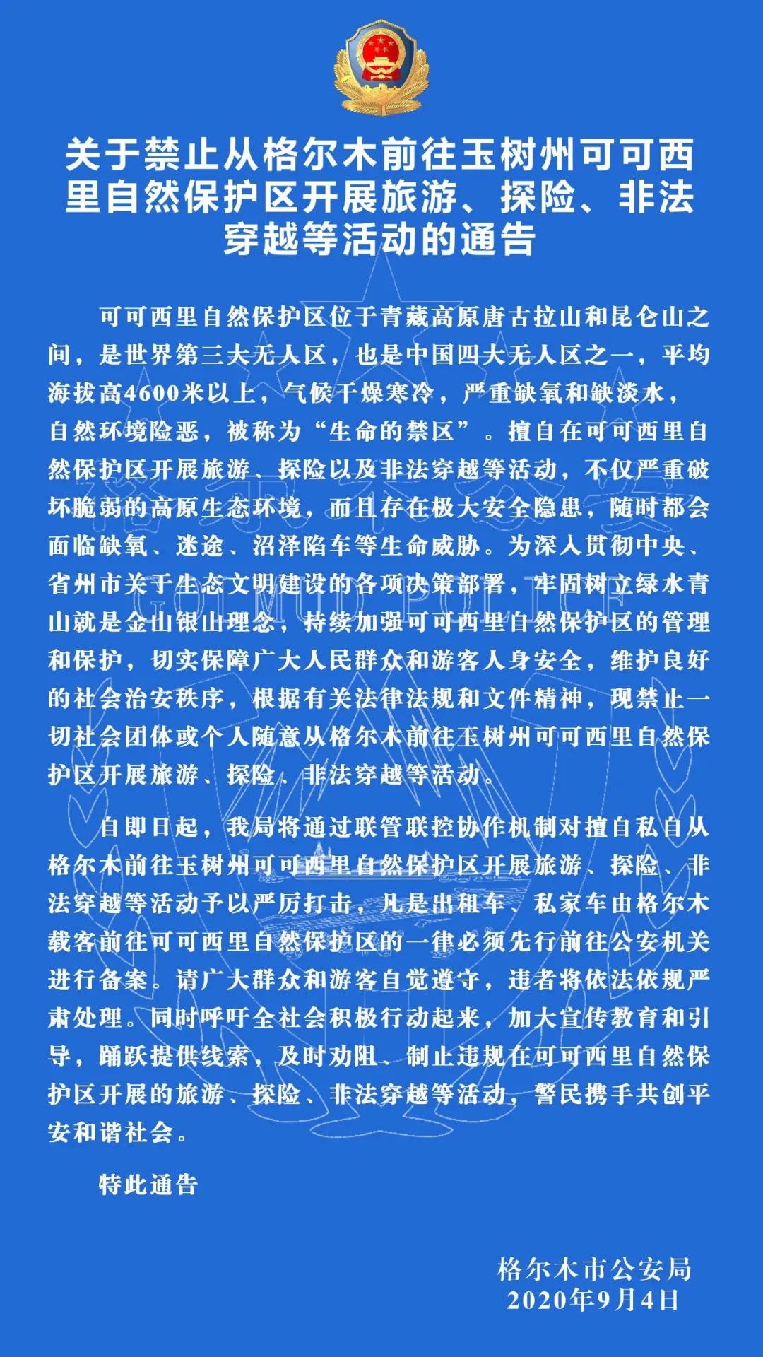 據(jù)格爾木公安微信公眾號消息,9月4日,青海省格爾木市公安局發(fā)布通告,禁止一切社會團(tuán)體或個(gè)人隨意從格爾木前往玉樹州可可西里自然保護(hù)區(qū)開展旅游、探險(xiǎn)、非法穿越等活動,即日起將對上述行為予以嚴(yán)厲打擊,凡是出租車、私家車由格爾木載客前往可可西里自然保護(hù)區(qū)的一律必須先行前往公安機(jī)關(guān)進(jìn)行備案。