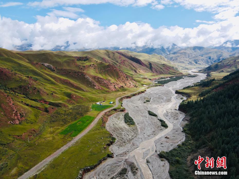 9月9日,航拍祁連山國家公園青海片區(qū)油葫蘆自然風(fēng)景區(qū)美景。初秋時(shí)節(jié),祁連山國家公園青海片區(qū)草地漸黃,天高云淡,勾勒出一幅色彩斑斕的秋日美景圖。中新社記者 李江寧 攝