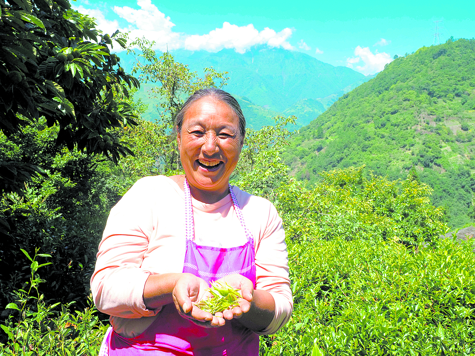 收獲新茶后,紫雅場(chǎng)村村民王美蓉喜笑顏開。于譚陽(yáng) 攝
