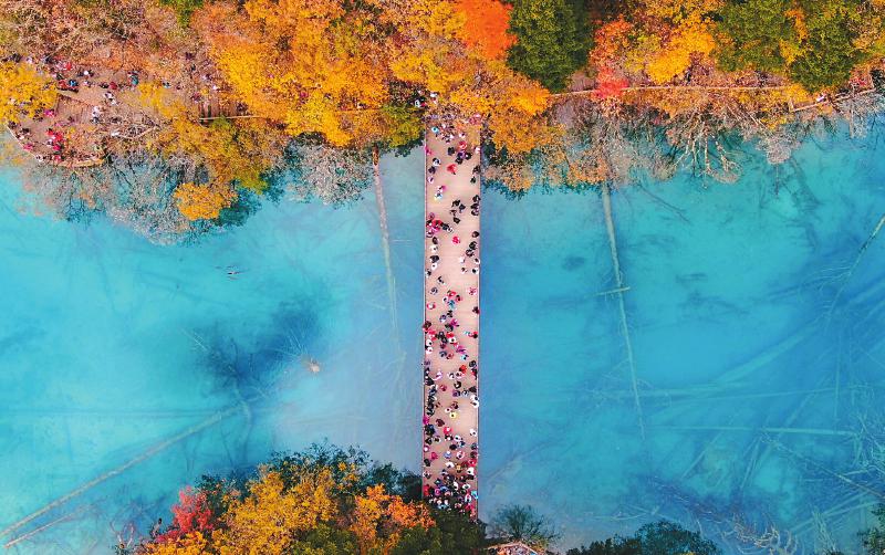 深秋的九寨溝景區(qū),五花海景點引來游客觀賞彩林、海子。 蘇楊 攝