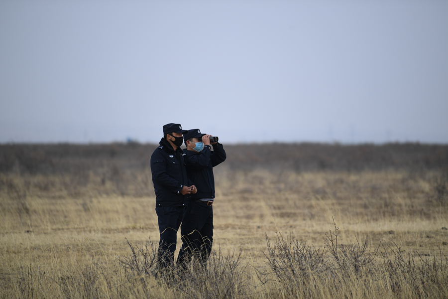11月20日,剛察縣森林公安局哈爾蓋派出所民警秦輝武(右一)和輔警東知布在特護區(qū)內(nèi)進行日常巡護。新華網(wǎng) 潘彬彬 攝