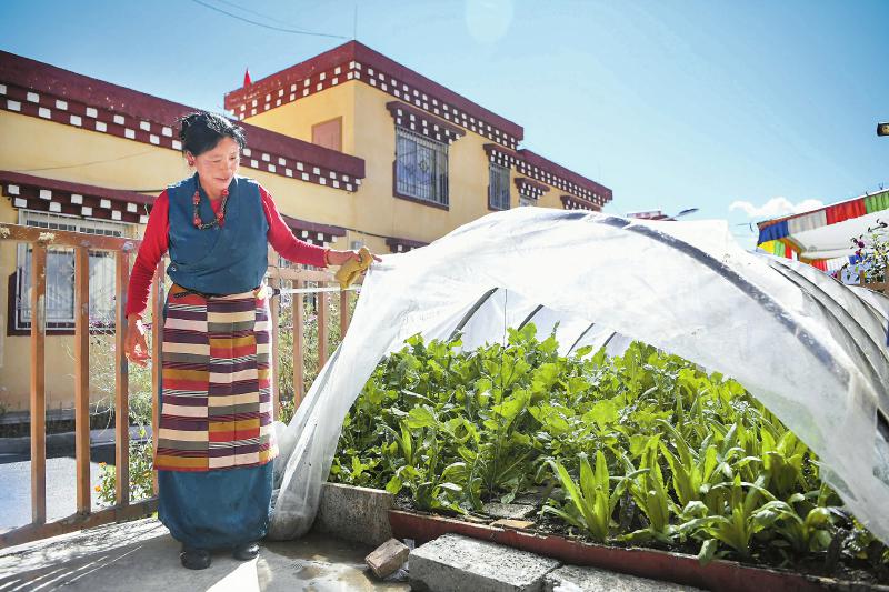10月12日,甘孜縣吉絨隆溝集中安置點(diǎn)村民展示自己種植的蔬菜。四川日報(bào) 楊樹 攝
