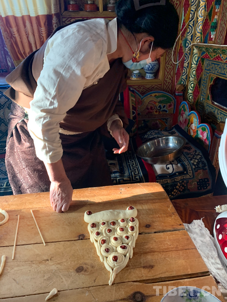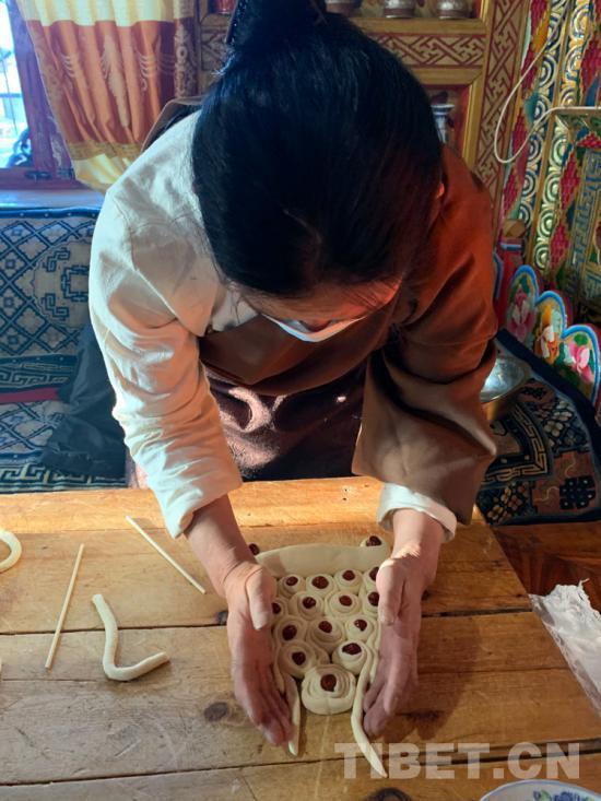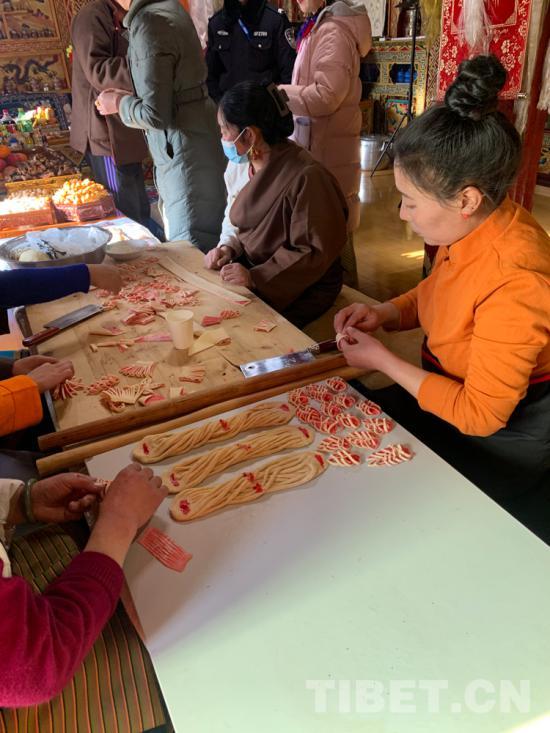 在理塘縣,“拿朵”是新年必不可少的傳統(tǒng)美食,這種以面粉為主要原料制作的酥油果子,因脆甜好看而備受男女老少的喜愛。
