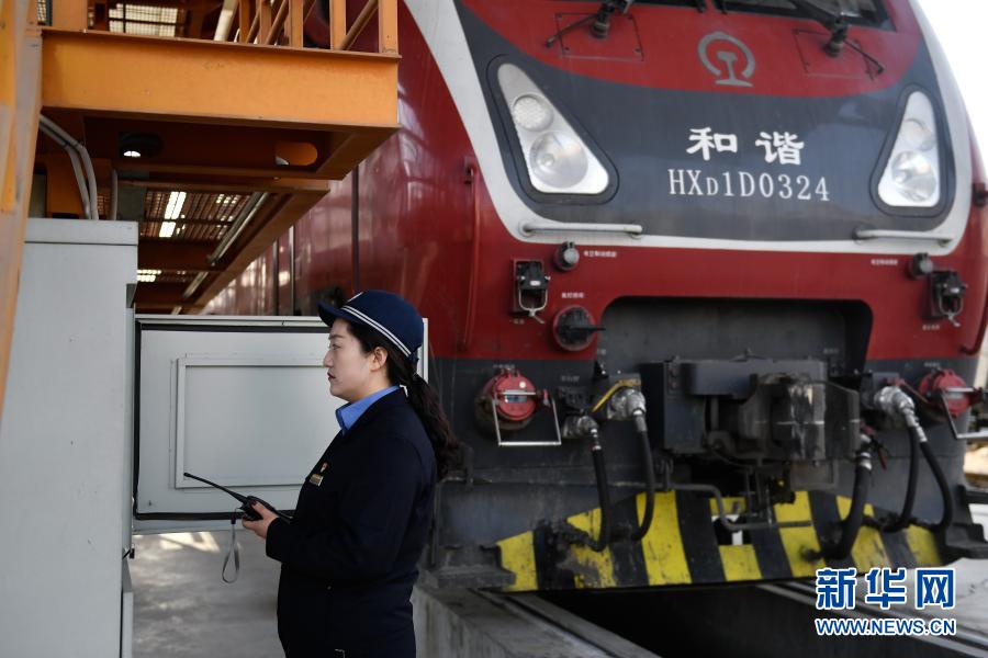 2月24日,在青藏鐵路公司西寧機(jī)務(wù)段整備車(chē)間,隔離開(kāi)關(guān)班組成員賀霞(左)在工作中。新華社記者 張龍 攝