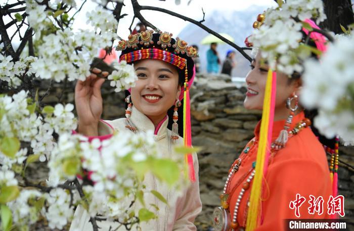 藏寨、碉樓下盛開的梨花,丹巴女孩穿梭鄉(xiāng)間小路。劉忠俊 攝