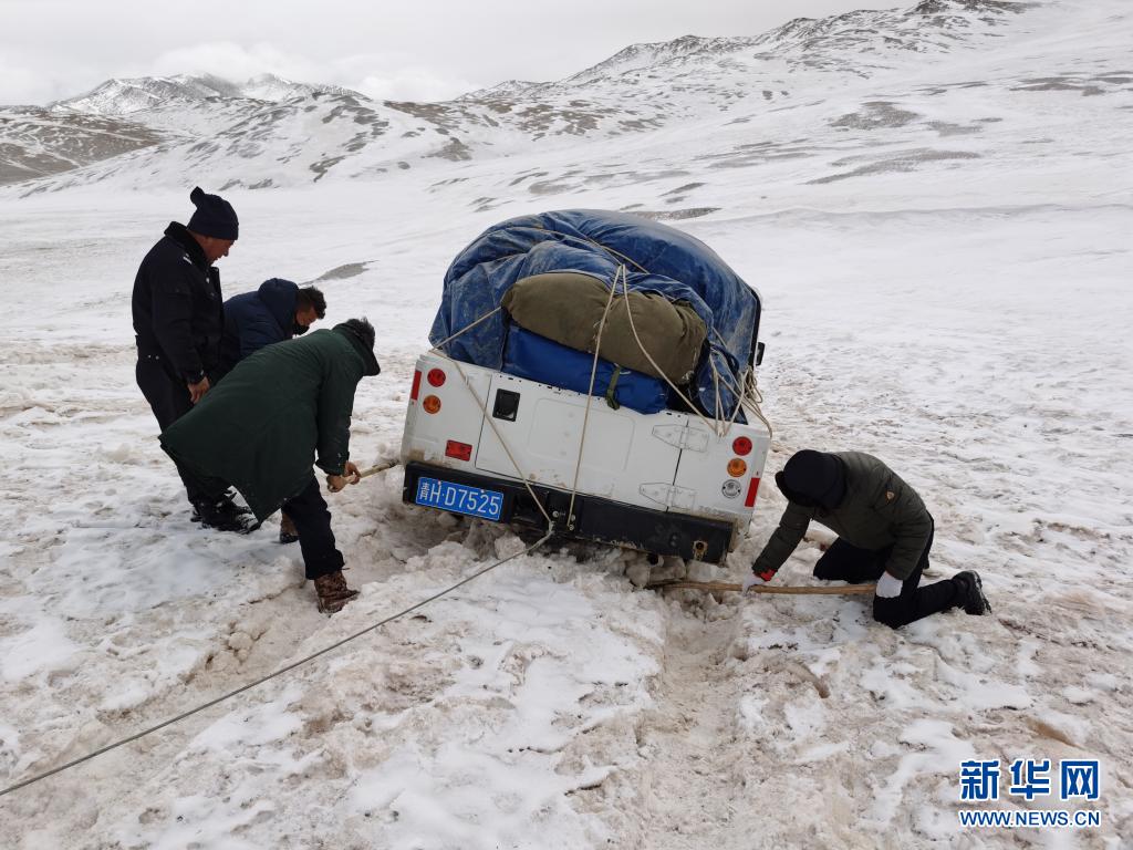 2020年3月,袁廣明(右一)和巡山隊員一起在可可西里巡山途中解困被陷車輛。新華社發(fā)