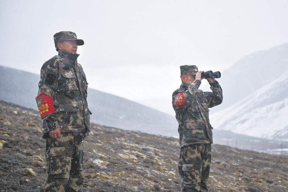 4月23日,祁連山國家公園沙龍灘管護站生態(tài)管護員羅藏次成(右)在巡護途中使用望遠鏡監(jiān)測野生動物。新華社 吳剛 攝