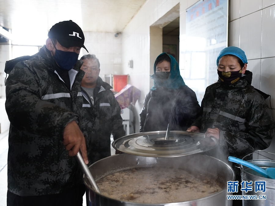 5月22日,在瑪多縣黃河鄉(xiāng)寄宿制學校救災安置點,老師們在給學生制作肉粥。新華社記者 張龍 攝