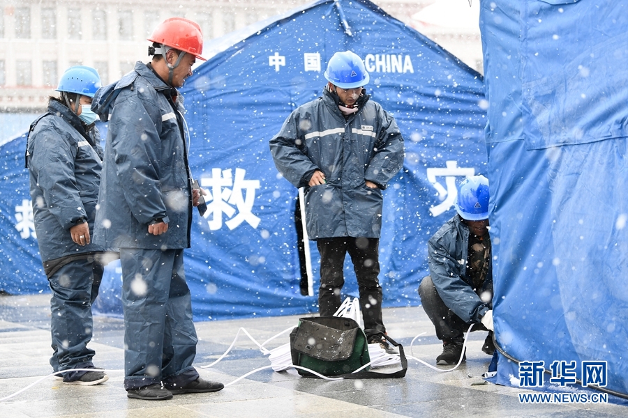 為了點亮災區(qū)首夜,國家電網(wǎng)青海省電力公司組織143名應急搶修人員,爭分奪秒為安置點通電。