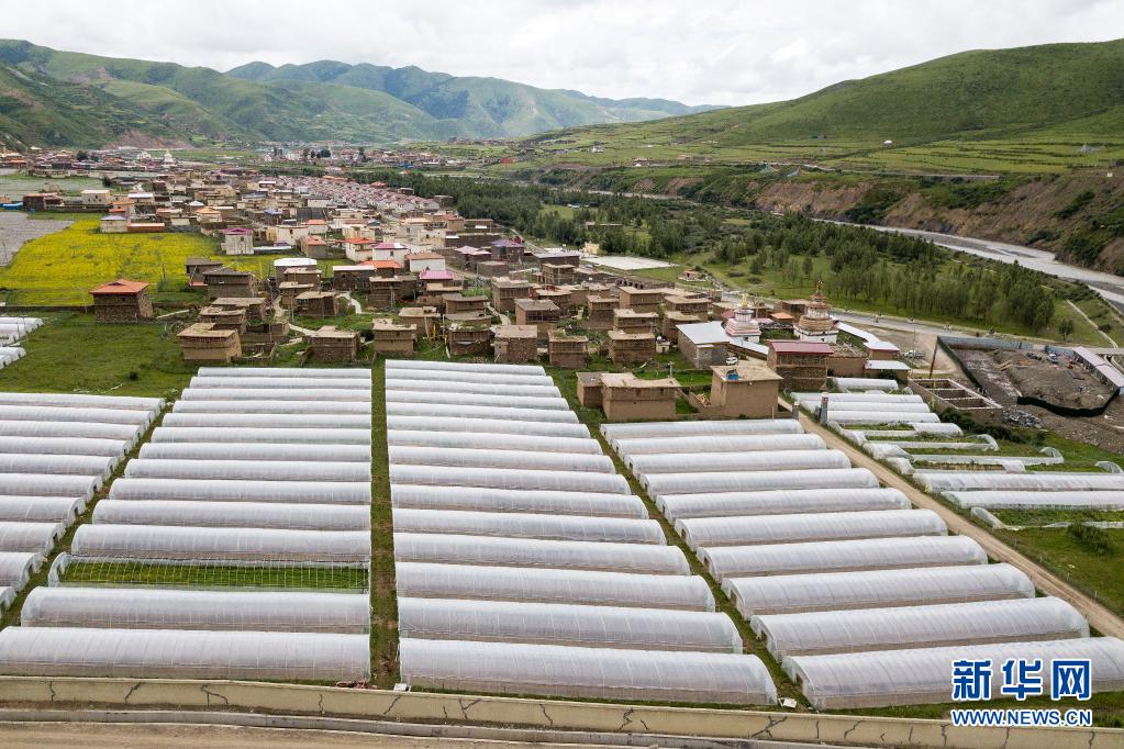 壤塘縣瑟谷村蔬菜基地內(nèi)的蔬菜大棚(7月17日攝,無(wú)人機(jī)照片)。新華社記者 李鑫 攝