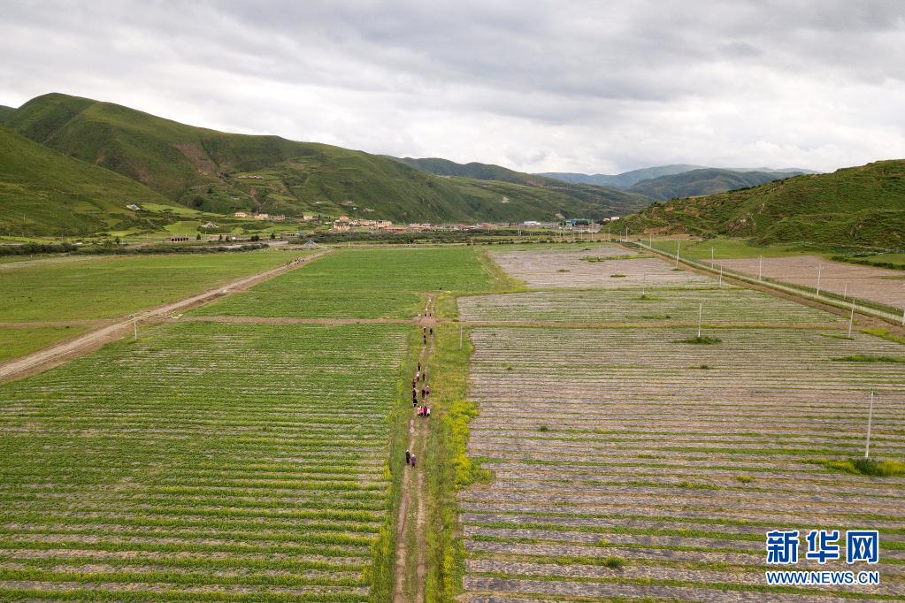 7月17日,壤塘縣瑟谷村農(nóng)牧民進(jìn)入蔬菜基地勞作(無(wú)人機(jī)照片)。新華社記者 李鑫 攝